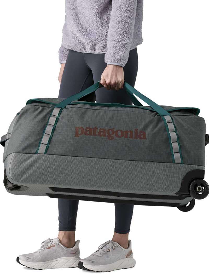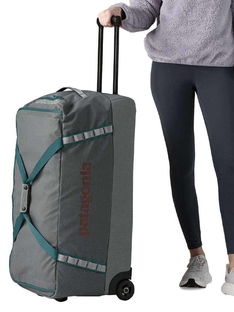 Patagonia's Black Hole Wheeled Duffel Bag 100L is a highly weather-resistant gear hauler with burly wheels and a telescoping handle. It's made with 100% recycled body fabric, lining and webbing.