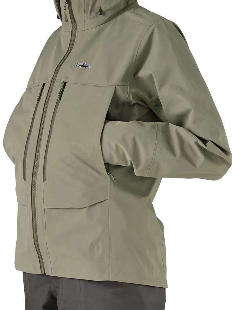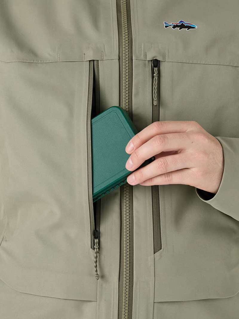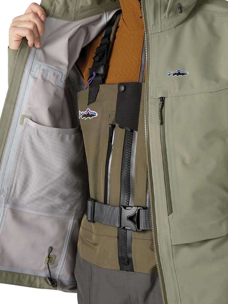 The jacket features front-zip pockets for fly boxes and zippered handwarmer pockets positioned for deep wading and feature flap covers for back-of-hand comfort. The vented hood is easily adjustable and the integrated collar provides maximum protection in heavy weather and high winds (hood is designed to accommodate all headwear). The cuffs are watertight and adjustable, which will keep your arms dry when releasing fish!