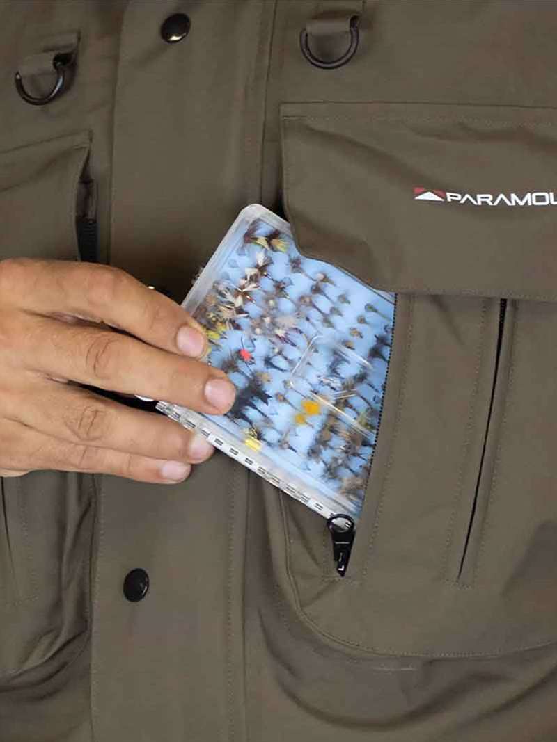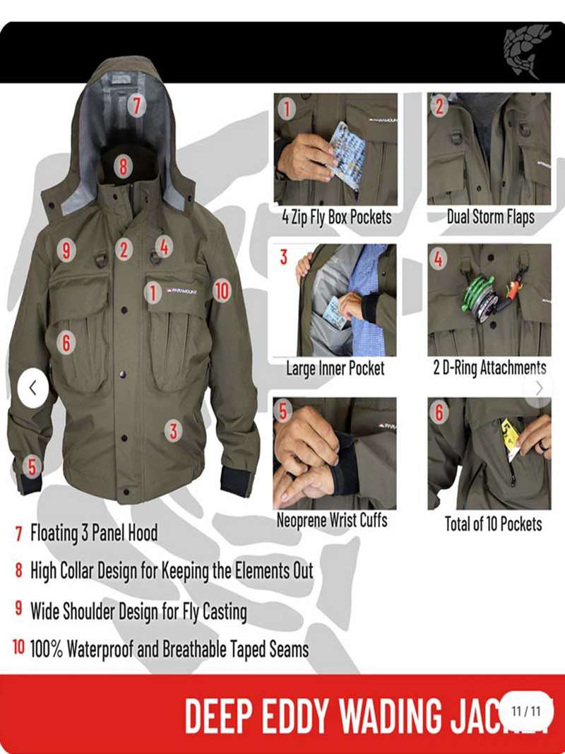 The Paramount DEEP EDDY wading jacket is 100% waterproof and breathable with fully taped and sealed seams for watertight protection. Constructed with the ideal features you need when you're on the water. Coupled with a full size adjustable 3-panel floating designed for fly casting.