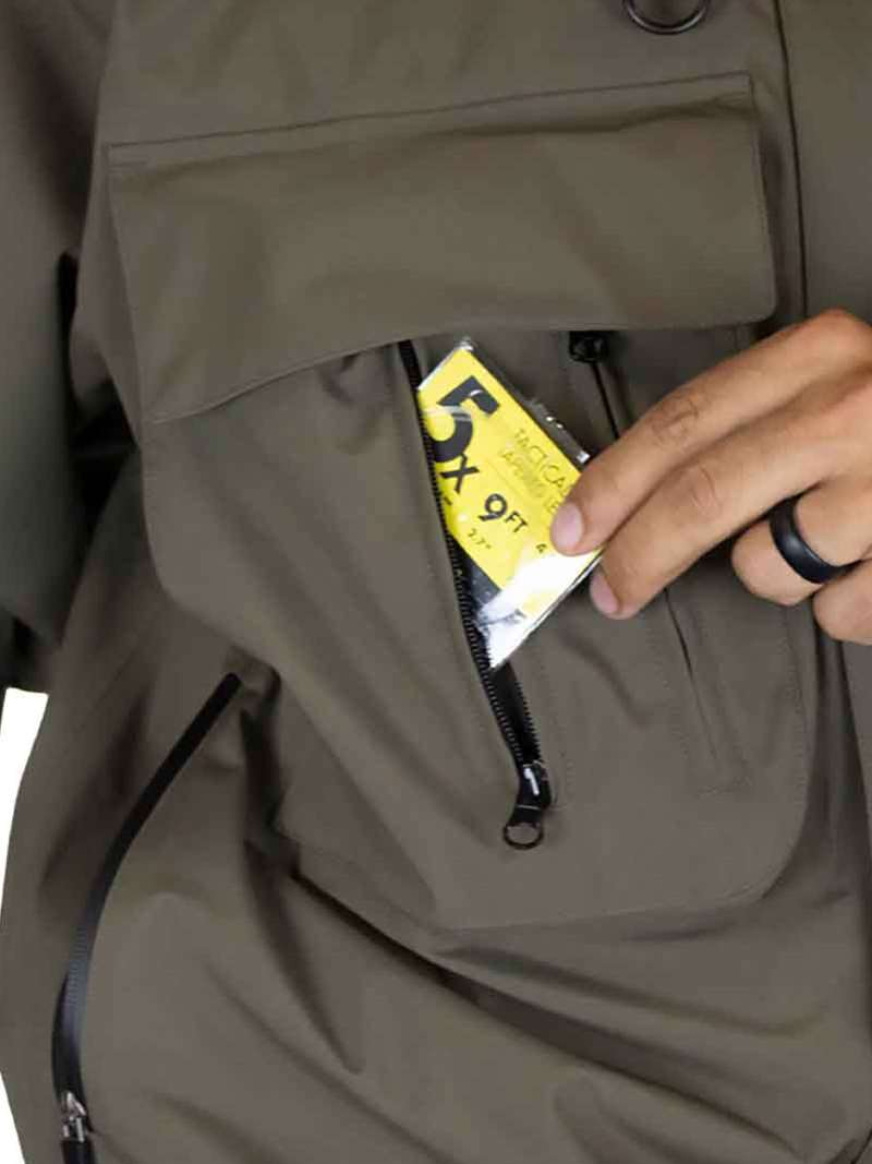 Storage will not be a problem with the DEEP EDDY wading jacket. With 4 zippered fly box pockets, dual lower side zip pockets, two top entry hook and loop chest pockets. Lastly dual micro fleece lined highwater pockets. Additionally, two large inner pockets offer dry storage. The Wrist cuffs on this wading jacket are made from 3mm neoprene for a watertight fit. Neoprene cuffs help stop water running down your arm after releasing a fish and raising your arm to cast. The waist band features elastic along with a draw cord adjustment. Finally the DEEP EDDY fly fishing jacket features a front zip with dual storm flaps for waterproof protection.