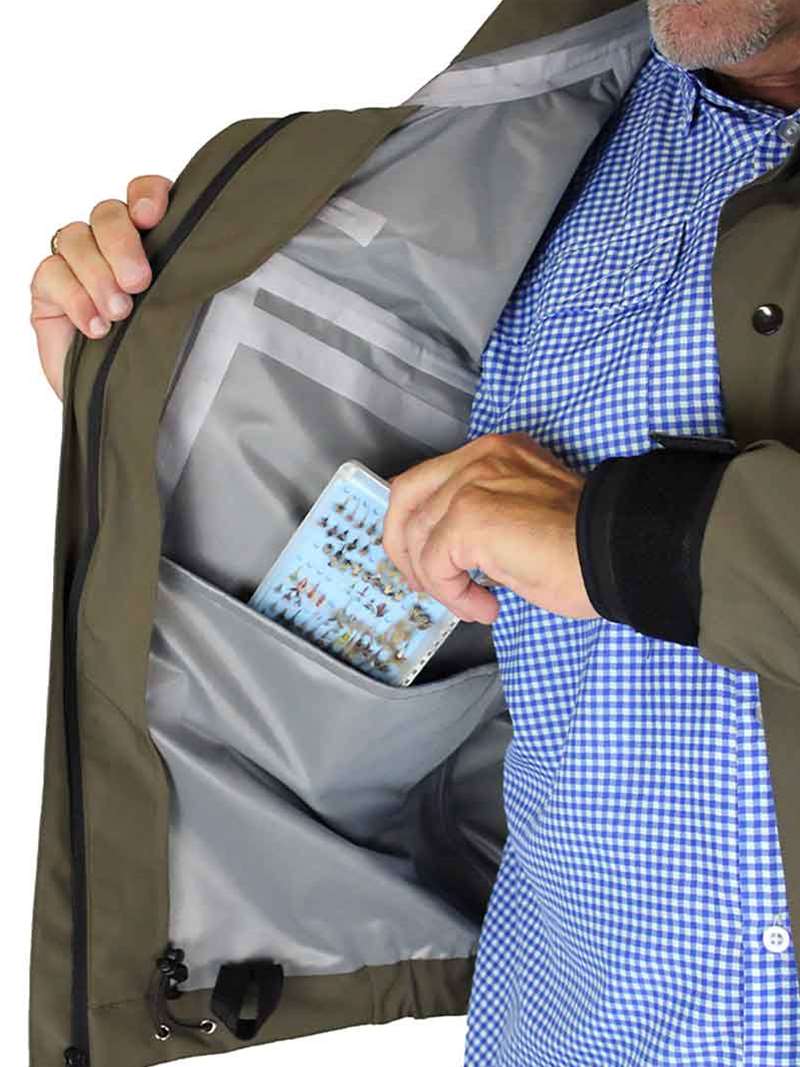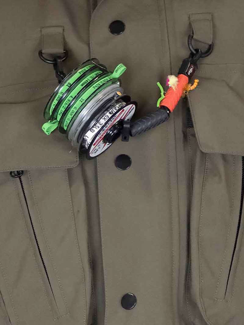 * FLY FISHING ACCESSORIES attachment points are a huge benefit to this wading jacket with bottom rod loop and chest strap. Additional D-Ring attachment points on chest.