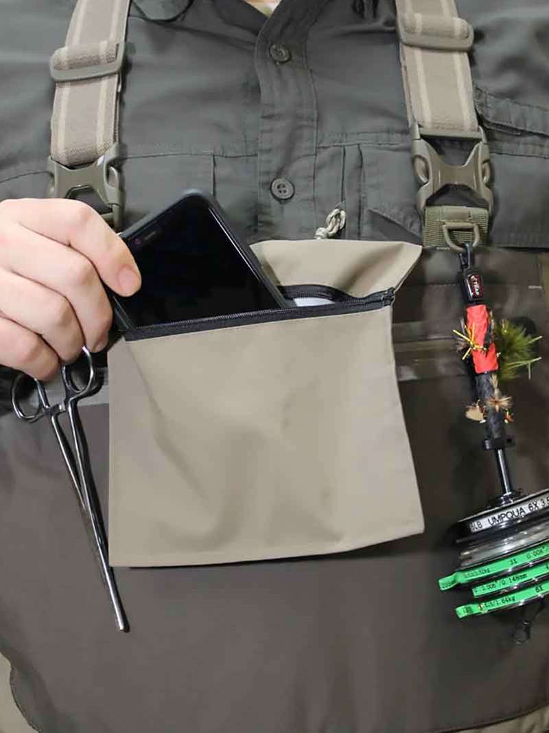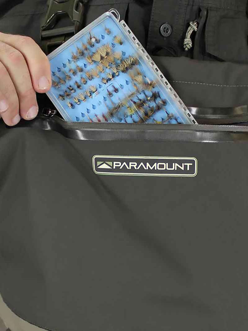 * POCKETS: Features a front chest zippered fly box top entry pocket along with a fleece lined pass through chest pocket and internal flip out pocket.