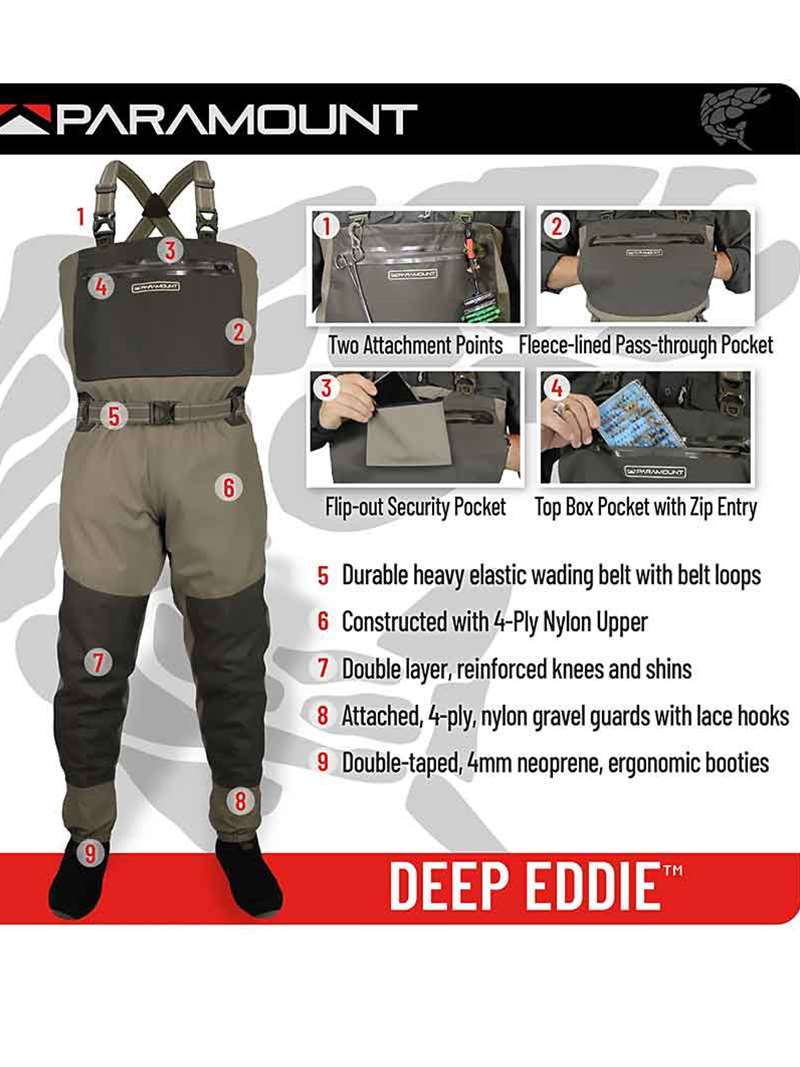 The Paramount DEEP EDDY breathable stockingfoot chest wader is an excellent value with proven performance. Coupled with the best components, quality craftmanship, and waterproof breathable 4-ply nylon performance fabrics.