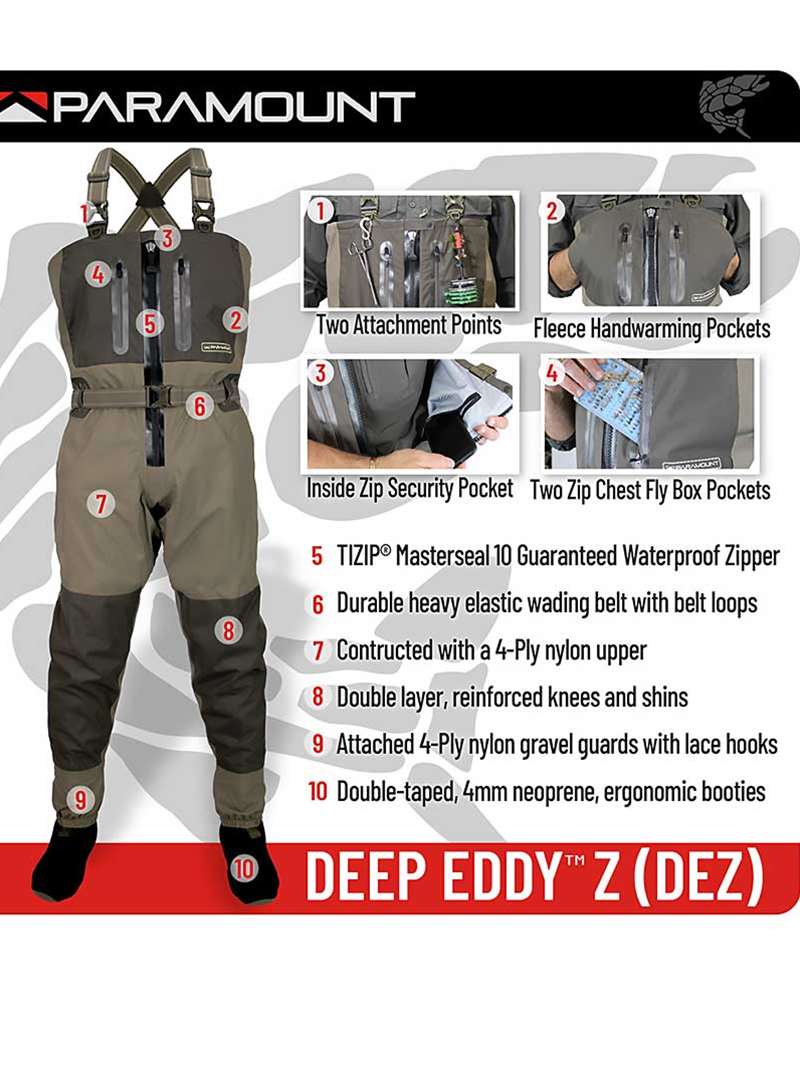 The Paramount DEEP EDDY Z Wader is the best value zip front wader on the water. Featuring the German engineered Ti-Zip waterproof full front zip. Coupled with 4-ply puncture resistant nylon fabric along with double reinforced lower legs.