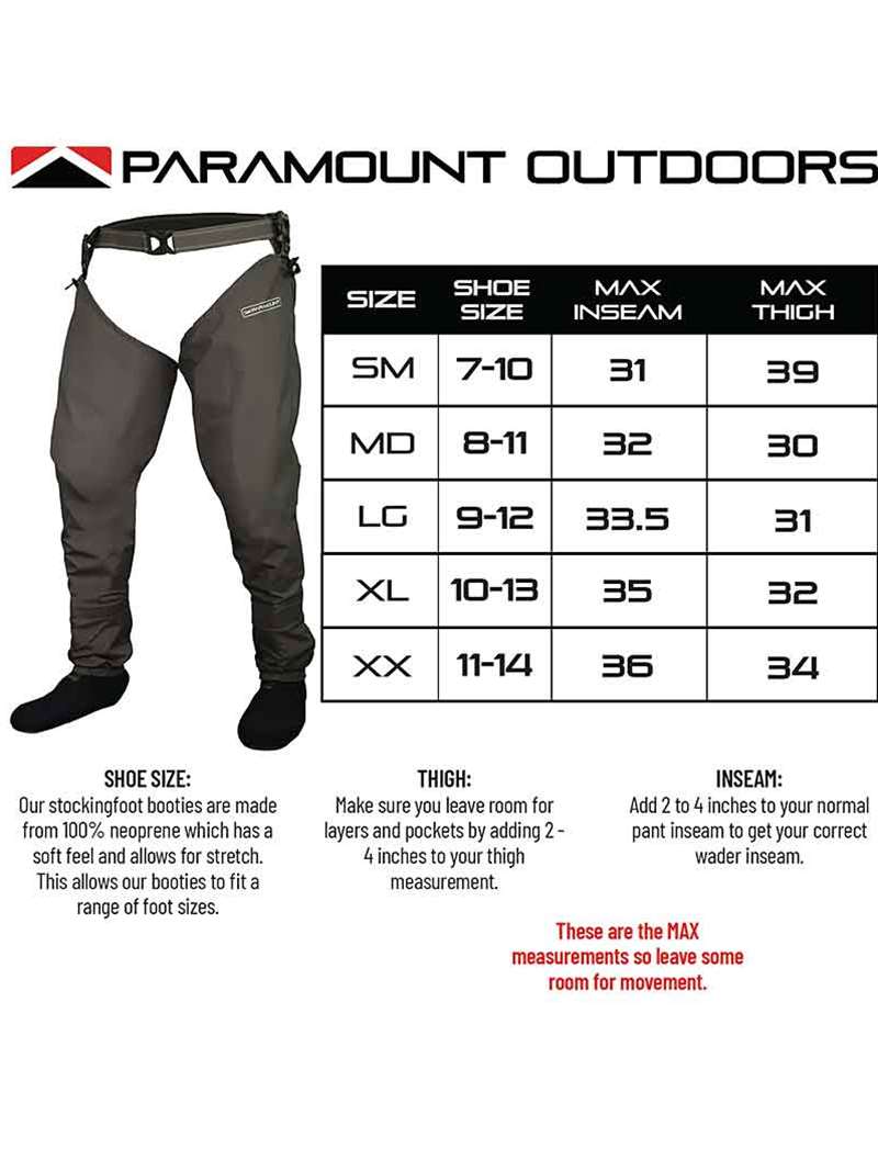 * DOUBLE TAPED NEOPRENE BOOTIES are protected by gravel guards. This wader is designed to be worn with wading boots.