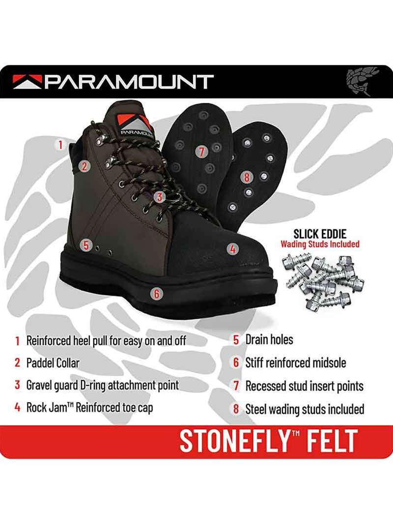 Coupled with the Rock Jam toe cap gives you the reinforcement you need where you need it most for lasting protection. Additionally, the reinforced stiff midsole provides a sure and solid step every time on uneven surfaces. The Stonefly felt wading shoe also features recessed stud insert points for maximum traction on slick rocks or muddy banks. Lastly, the steel Slick Eddie studs are included and the Stonefly can be worn with or without wading studs .