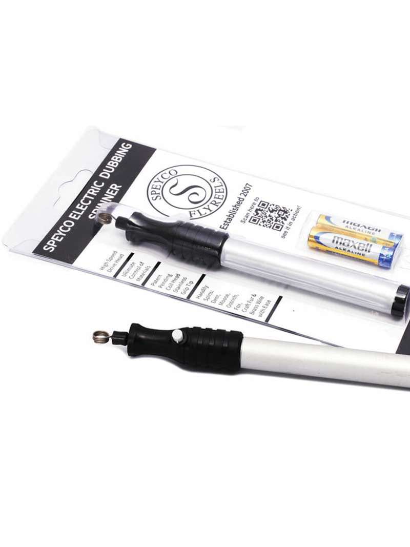 The Speyco Electric Dubbing Spinner has a high speed drive head that provides ultimate control of materials. It spins deer, moose, ostrich, fox, craft fur and brass wire with ease.