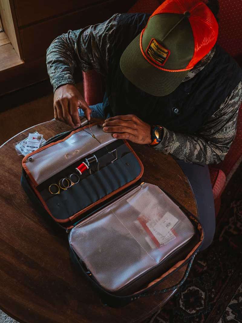 The Fishpond Backwater Fly Tying Kit packs smart organization into a compact footprint that slips easily into carry-on or checked luggage. Two large see-through pouches keep materials visible and tidy, while a padded interior pocket with a stretch sleeve secures your pedestal base and vise heads. A streamlined hypalon tool page offers quick access to everyday essentials without wasting space, or tearing up your delicate tying materials. Load up, zip up, and tie wherever the trip takes you.