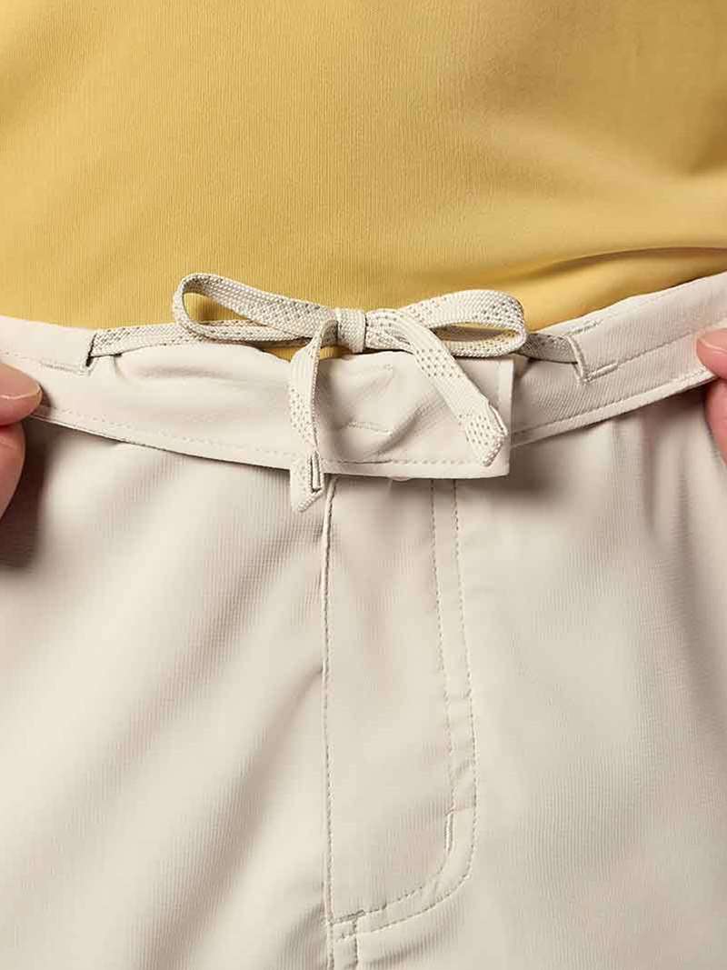 * Fixed waistband with a zippered fly, reinforced belt loops, button front closure, and interior drawcord to cinch secure