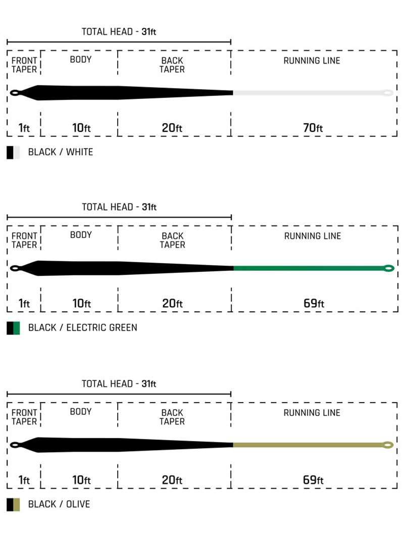 Available in 230 grain- 6/7 wt (white running line), 280 grain- 7/8 wt (electric green running line) and 330 grain- 8/9 wt (olive running line).