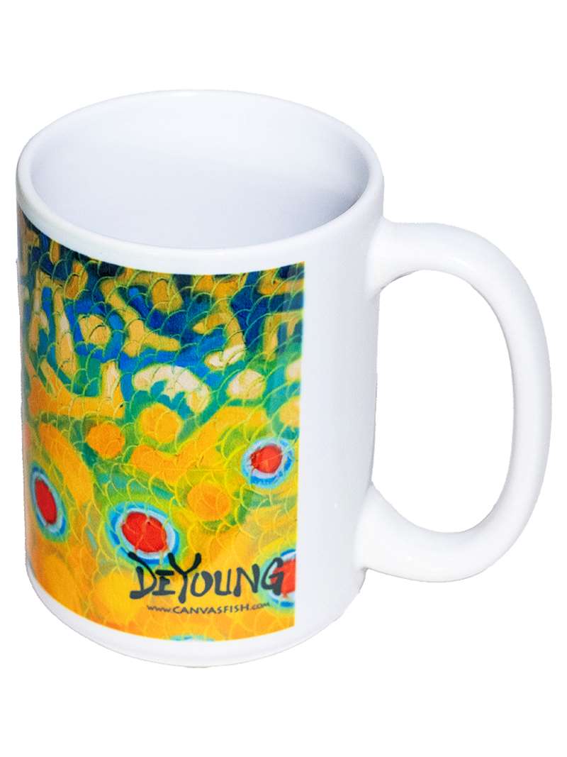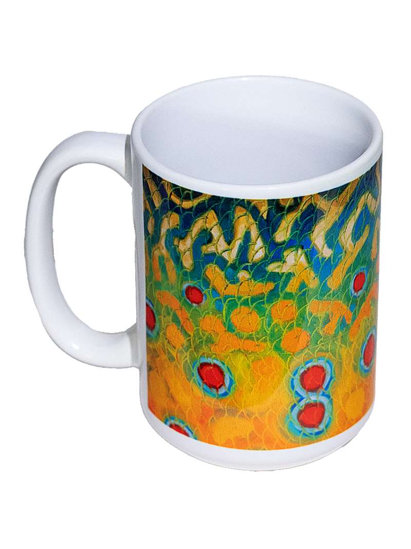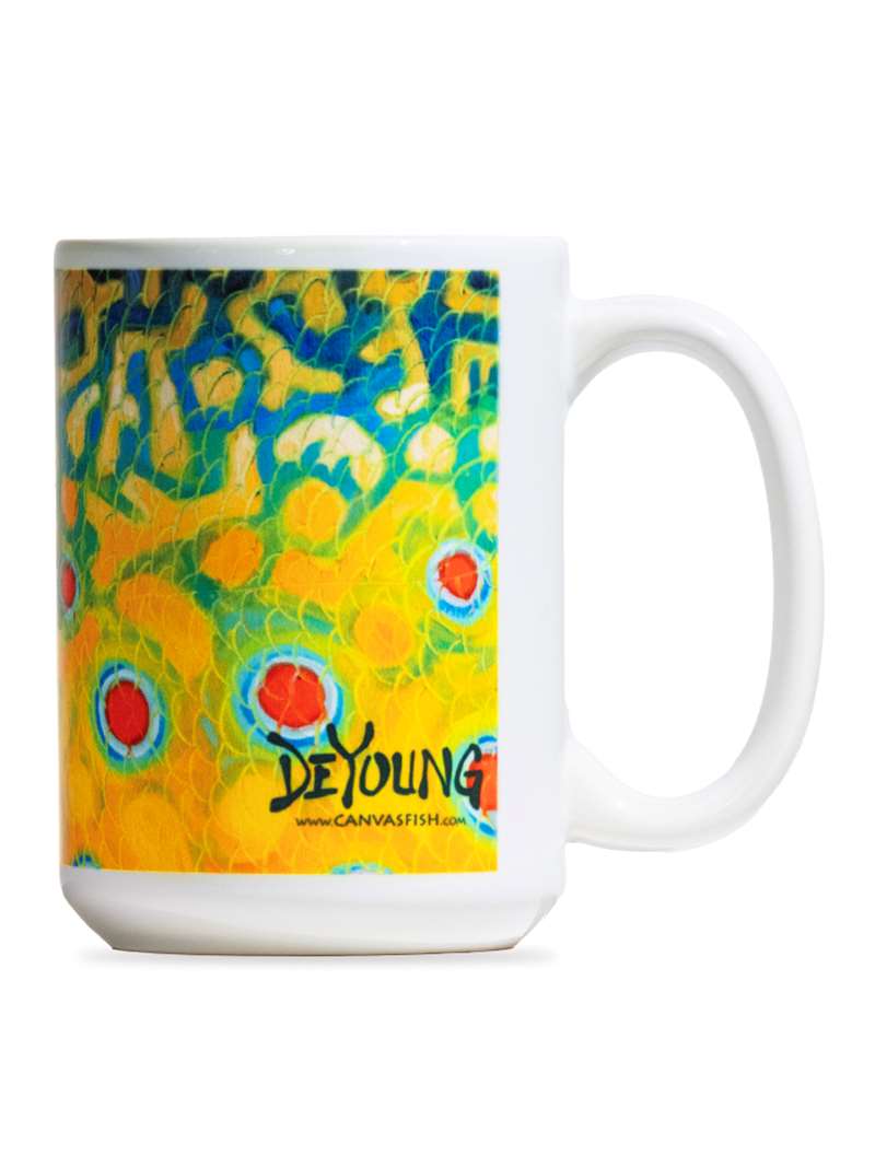 Derek DeYoung's Coffee Mugs are 15 oz. and very hefty. These full printed mugs showcase the best of Derek’s Abstract Fish Flank Series in bright, vivid detail. Available here in the Brook Trout. Microwave safe, but not dishwasher recommended. Made in the USA.